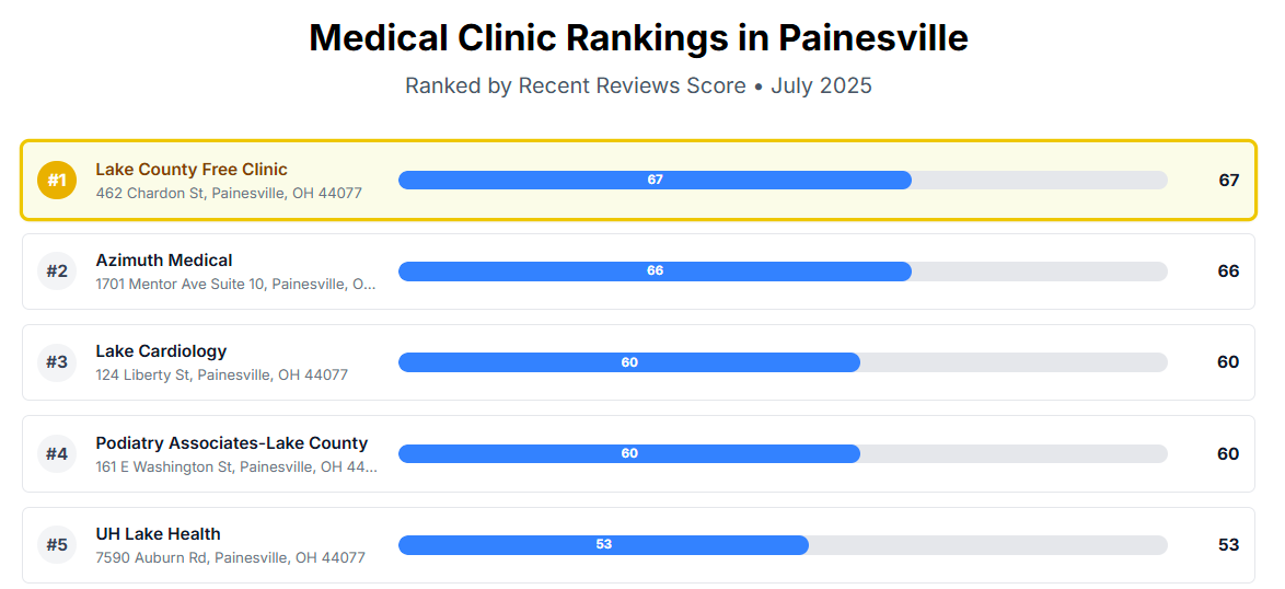 Thanks to the honest feedback and heartfelt stories shared by our patients, Lake County Free Clinic (LCFC) is officially ranked #1 in Painesville based on Google Reviews for local clinics.